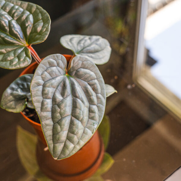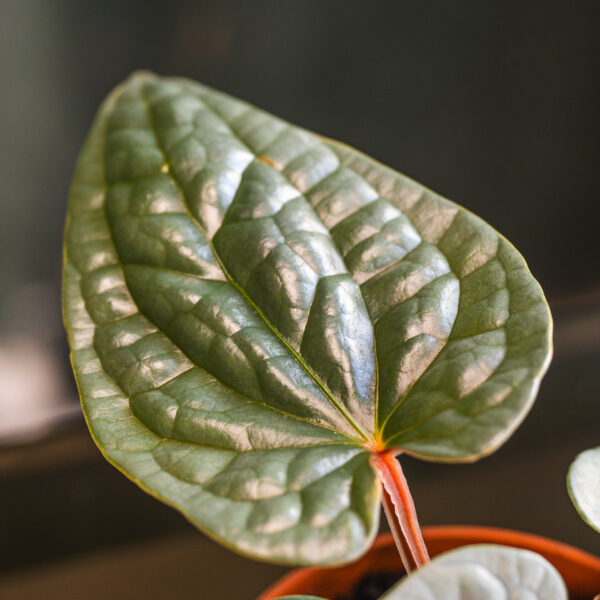 The leaves of Anthurium luxurians are dark green, deeply veined, and have a unique, almost quilted appearance. As the plant matures, the leaves become more textured and can grow quite large. It’s a slow-growing plant that typically stays compact, making it well-suited for indoor spaces.