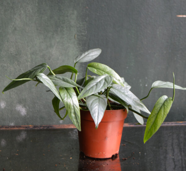 Epipremnum Pinnatum Cebu Blue is a beautiful vine with elongated, silver-blue foliage. As the plant matures and gets to climb, the leaves change the shape and get the characteristic splits. Commonly known as ‘Pothos’, it can whit-stand pretty dark places, however that can impact the coloration that it has.