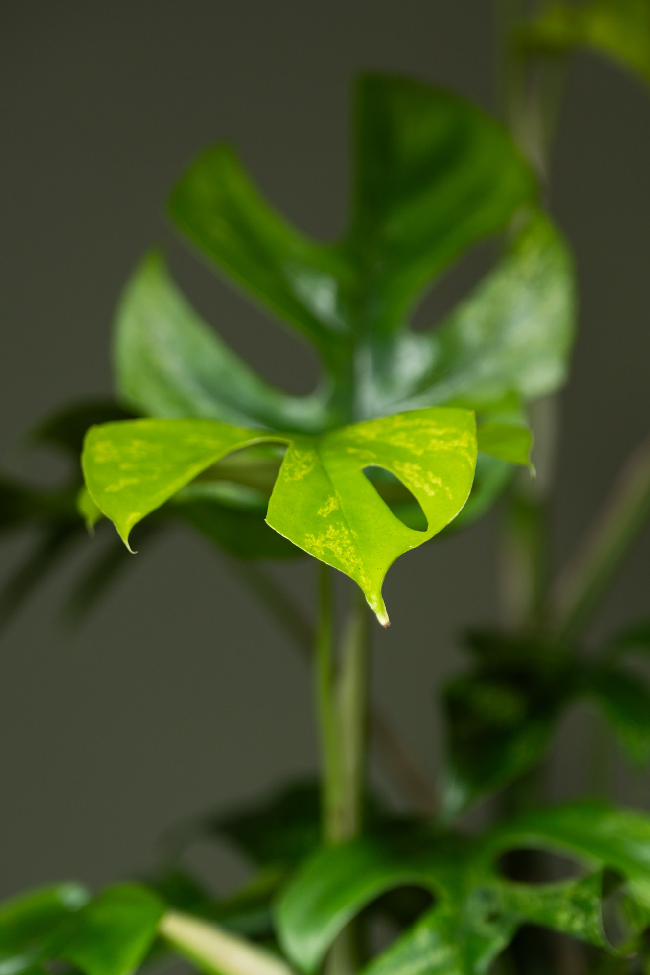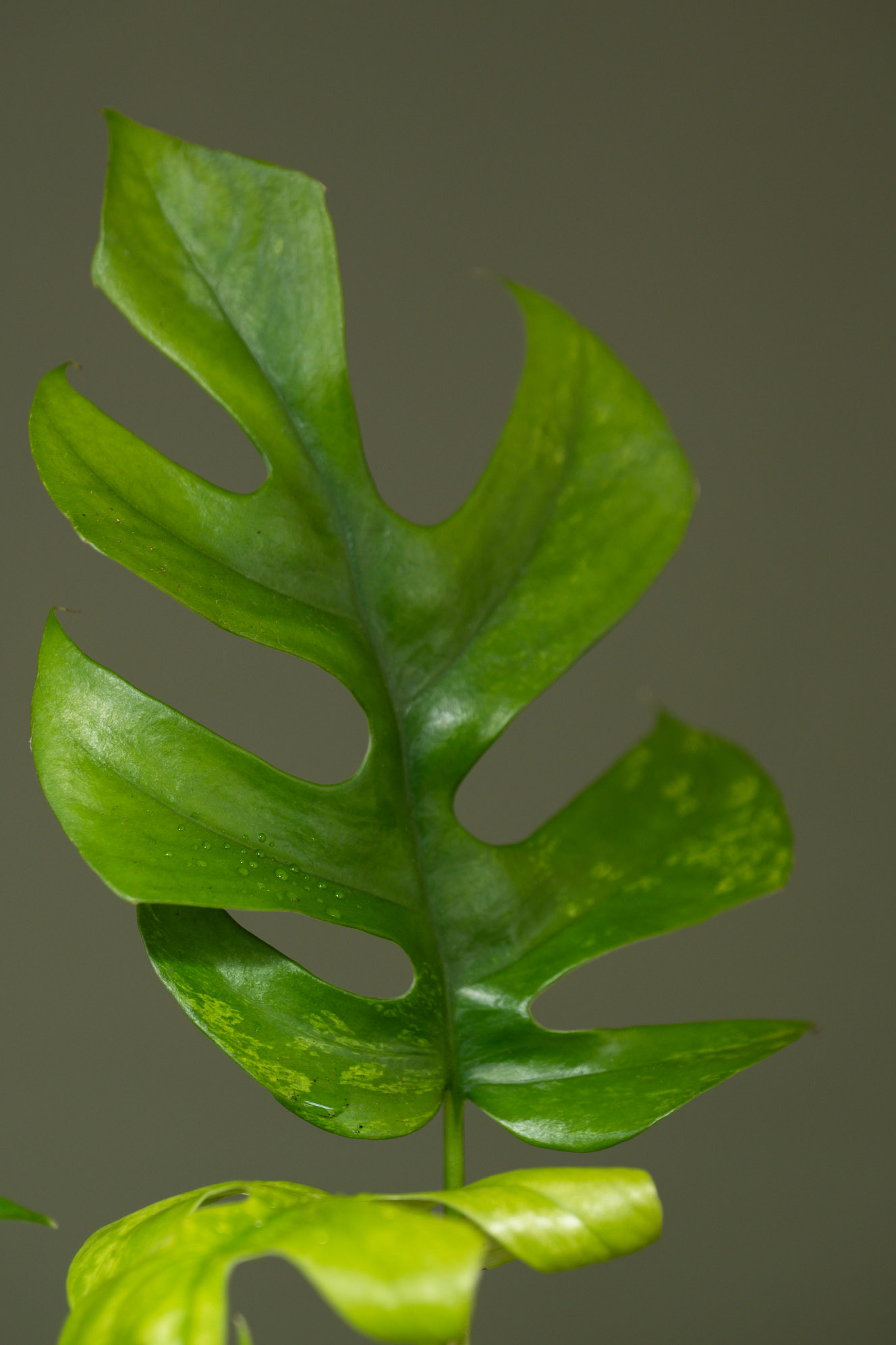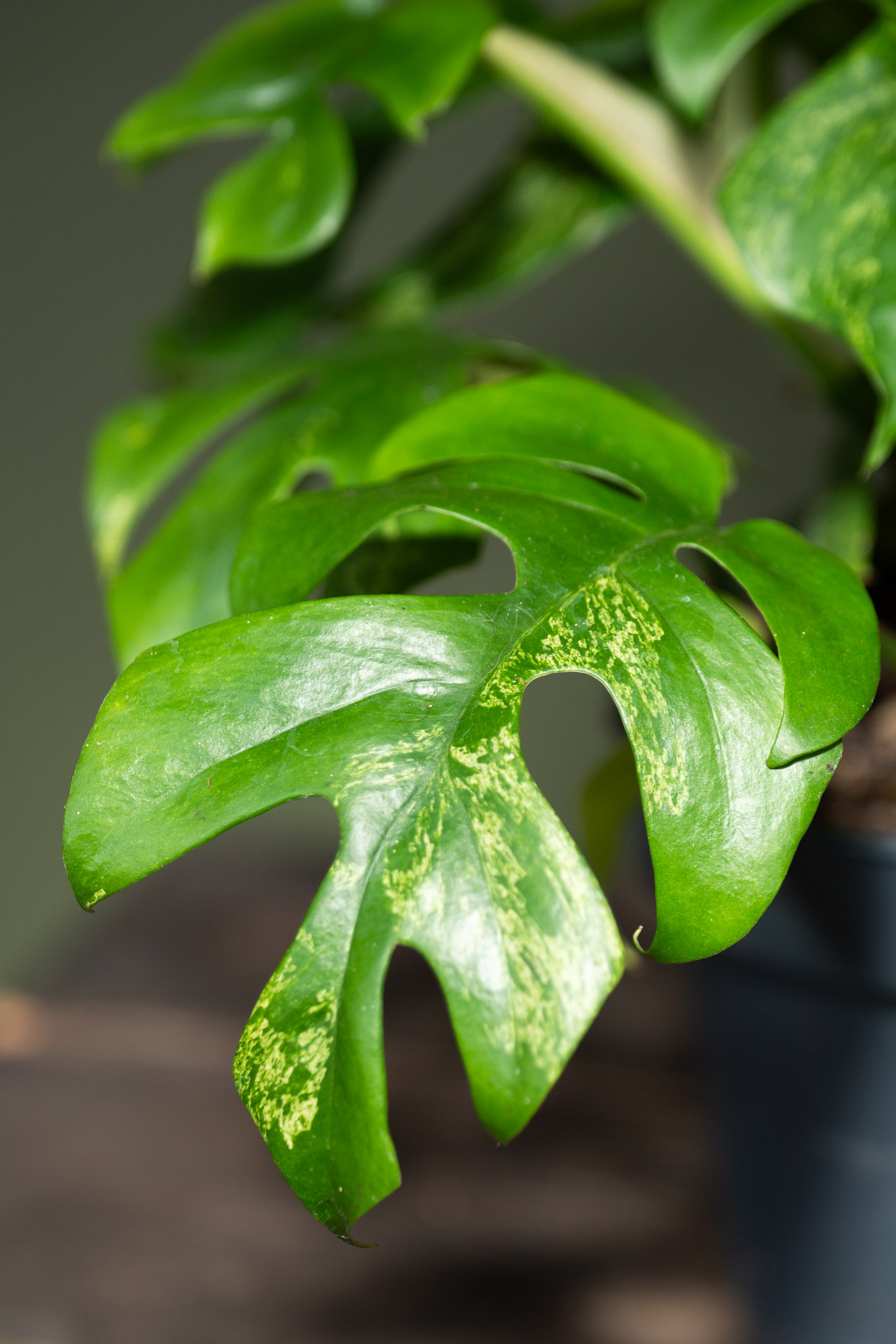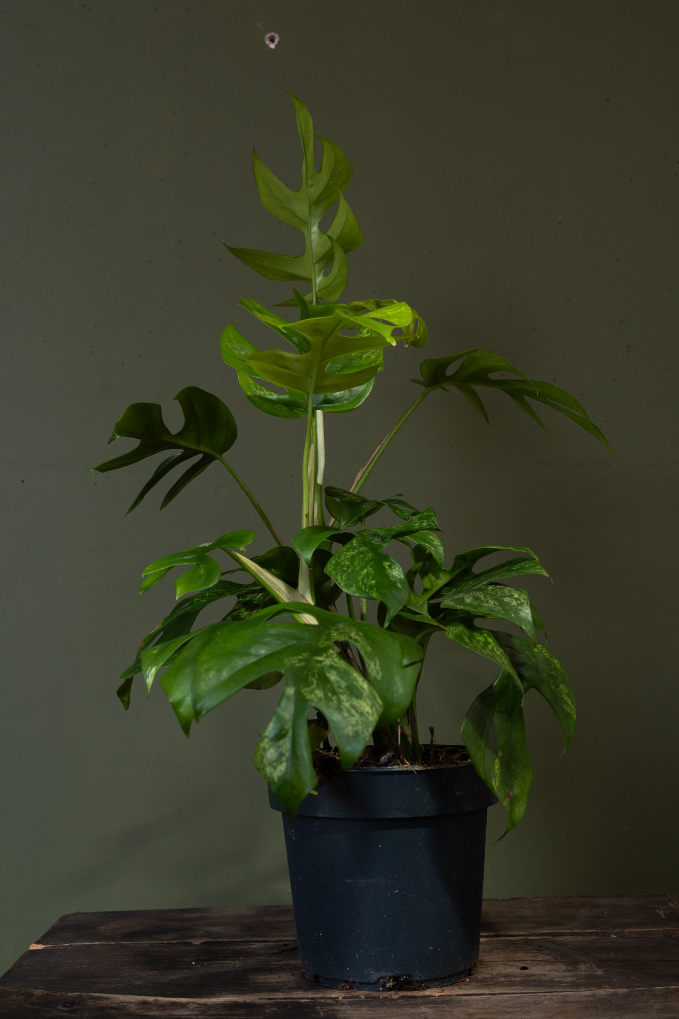 Rhaphidophora tetrasperma ‘Marmer’ is a rare variegated form of the popular “mini monstera.” It features smaller, split leaves with marbled patterns of creamy white and green, giving it a striking, high-contrast look. As a climbing plant, it benefits from support like a moss pole and can grow quickly in the right conditions.